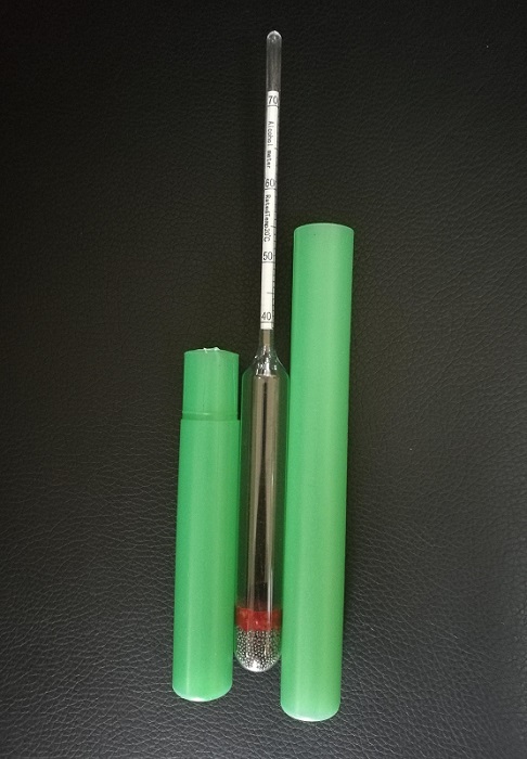 Спиртометр 40-70% объемного содержания спирта. Погрешность 1%. В пластиковой тубе.