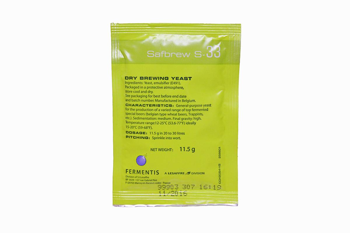 Дрожжи Fermentis Safbrew S-33 верхового брожения с нейтральным ароматическим профилем. Сбраживающая способность низкая, что позволяет варить пиво с длительным вкусовым букетом. Температура брожения – 12-25°C, идеально при 15-20°C.