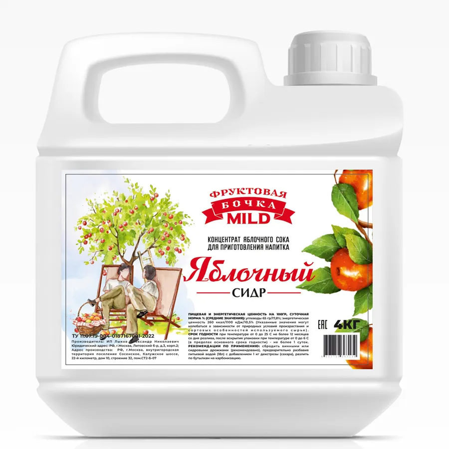 ЯБЛОЧНЫЙ СИДР, концентрированный сок для приготовления сидра, Фруктовая Бочка MILD, 4 кг