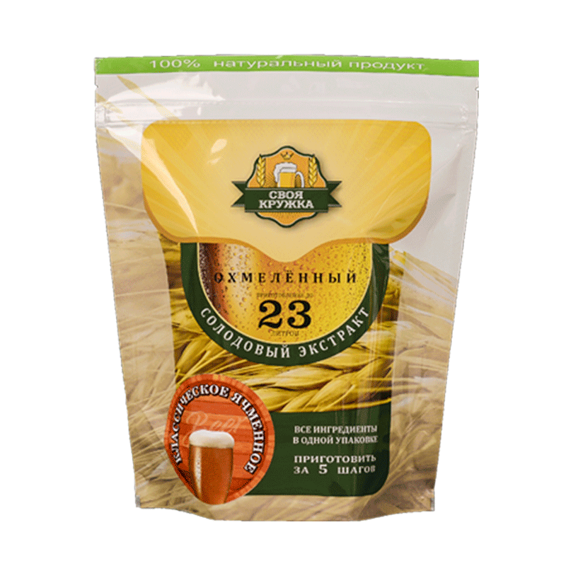 «Своя Кружка» Ячменное классическое - светлый янтарный классический сорт пива. Рассчитан на приготовление 20-23 литров. Умеренная хмелевая горечь, яркий мягкий солодовый аромат.