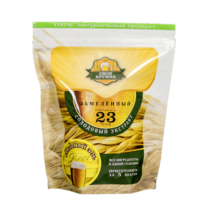 «Своя Кружка» Светлый эль - охмеленный солодовый экстракт светлого сорта пива. Сочетание основных светлых сортов ячменного солода и солода слабой обжарки придает пиву легкий освежающий вкус и светло соломенный цвет. Хмелевая горечь умеренная. Дополнительную ароматику можно внести с помощью входящего в комплект натурального хмеля (инструкция прилагается).