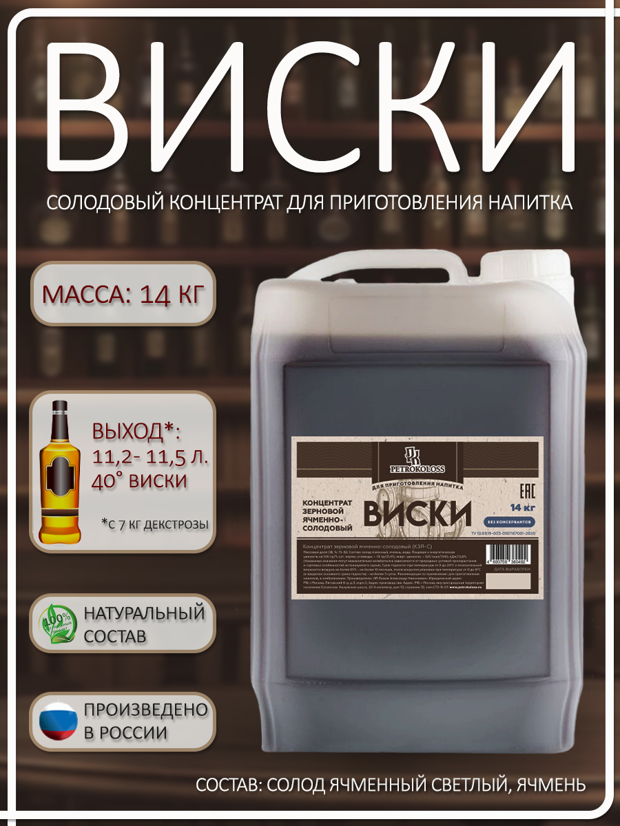 Солодовый концентрат для виски- это сусло, сваренное из 100% натурального сырья и обезвоженное на вакуумной установке. натуральный концентрат для виски избавит от сложной и затратной по времени процедуры приготовления сусла. После восстановления концентрата водой нет разницы со свежезатертым. Делая напиток из солодового концентрата, на выходе получается благородный канадский виски янтарного цвета, обладающий насыщенным вкусом с приятной сладостью, дубовыми оттенками и продолжительным послевкусием.